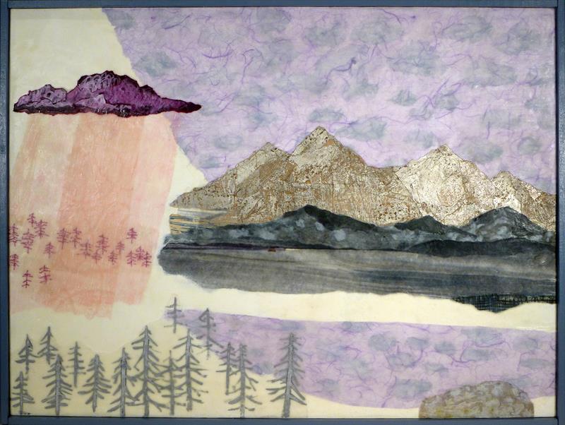 Raspberry Cloud and Lavender Sky 18x24, encaustic, paper, markers and ink, on wood panel,  $1600 by: Andrea Benson Entry ID: 580134