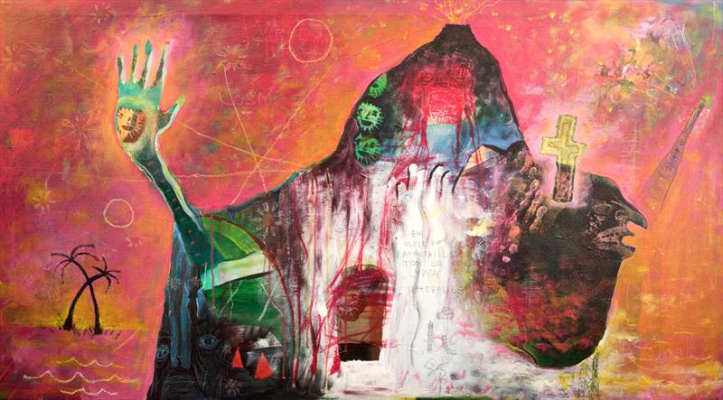 volcano-face-i-see-you 31x55, acrylic, oil pastel, pencil, on canvas,  $3500 by: Jesse Reno Entry ID: 580236