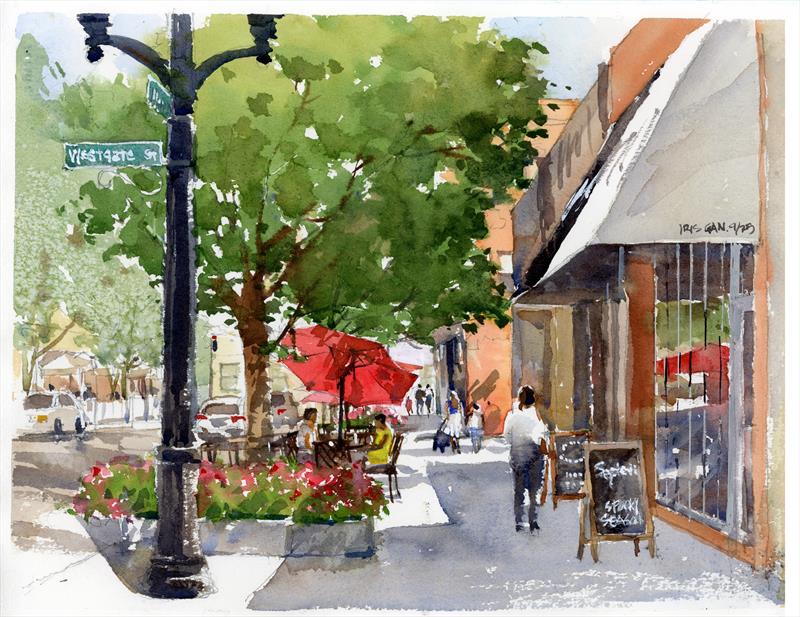 Red Umbrella on Marion St 10x14, Watercolor,  $NFS by: Iris Gan Entry ID: 583116