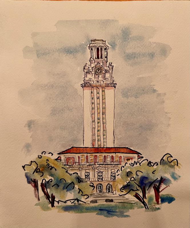 University of Texas Tower 9x12, Collage and Watercolor,  $200 by: steffani powell Entry ID: 585487