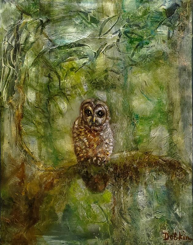 California Spotted Owl 14x11, Oil on Mixed Media ,  $875 by: Debra Dobkin Entry ID: 591122