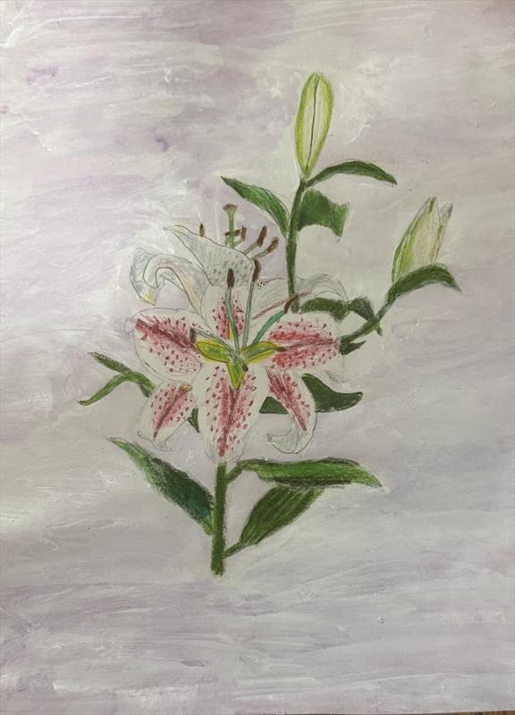 Lily in Bloom 12x9, Pencil Colors and Acrylic Paint,  $50 by: Tashvi Balaji Entry ID: 592385
