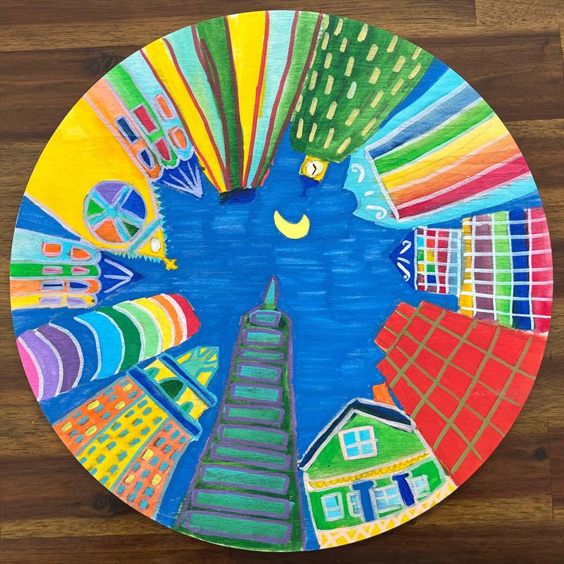 City at Night 13.8x13.8x0.13, Acrylic markers on plywood,  $50 by: Daniel Grad Entry ID: 592733
