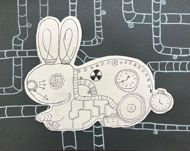 Steampunk Rabbit 11x14x0, Mixed media collage (acrylic and gel markers),  $50 by: Daniel Grad Entry ID: 592736
