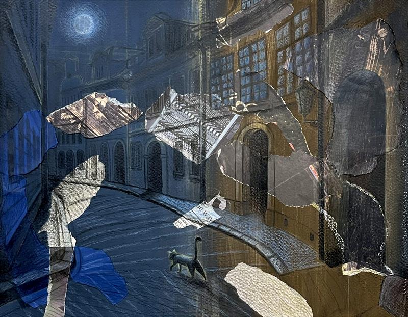 Into the Exploration 12x15, Gouache, colored pencil, colored papers, newspaper,  $1,000 by: Seojin Hwang Entry ID: 593161