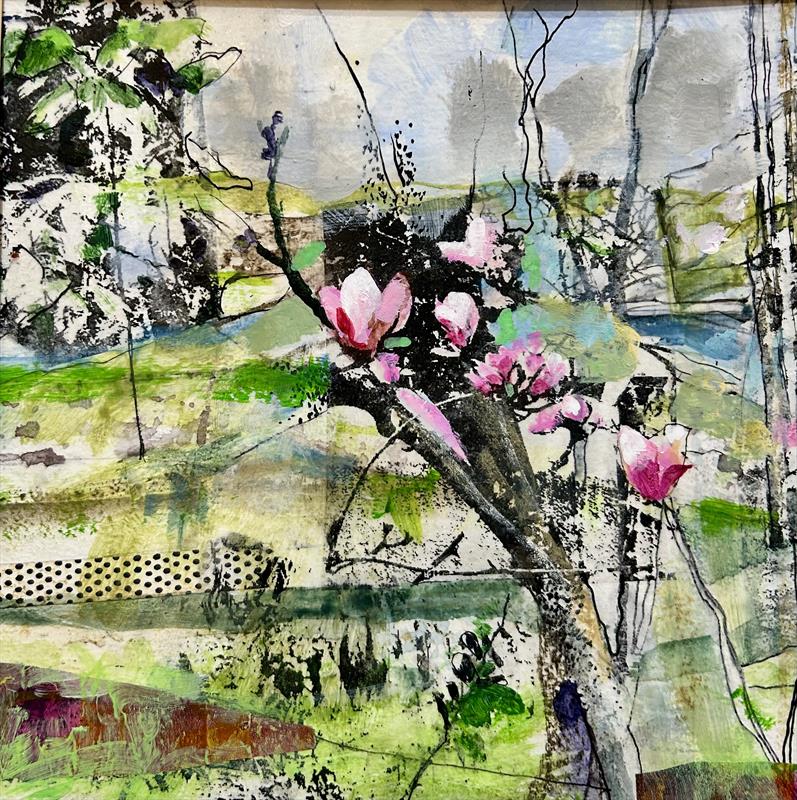 Spring 2 12x12x1, mixed media, acrylic inks, paint and image transfe,  $800 by: Margaret Terrall Entry ID: 592334