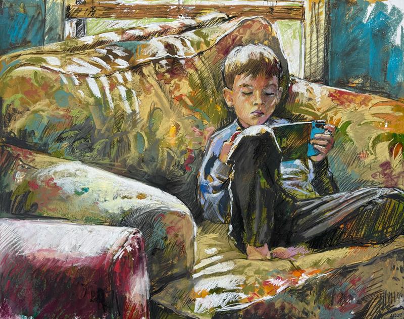 Aiden, Nintendo, and the Oversized Chair 23x29, Pastel and Watercolor on paper,  $1800 by: Jason McCann Entry ID: 577335