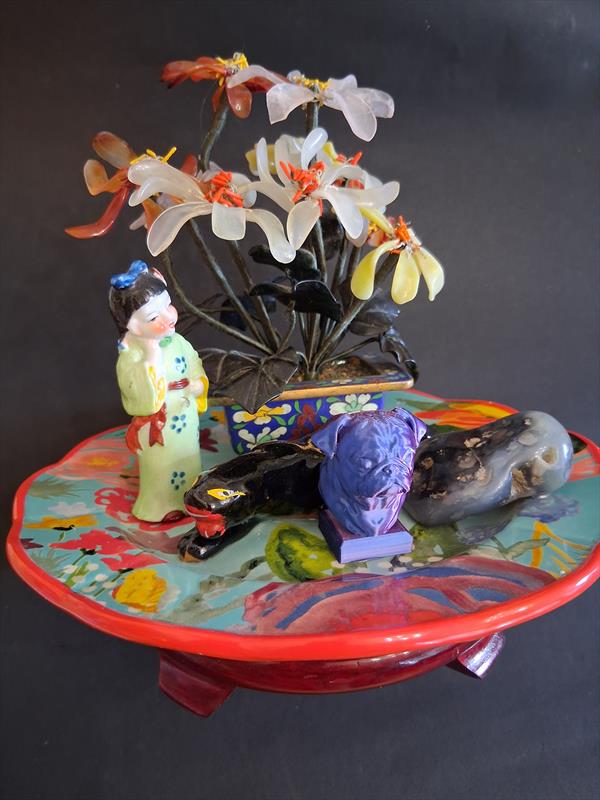 China Cat Sunflower 9x8, Assemblage of ceramics, stone, enamel and plastic,  $350 by: Randi Hawkins Garcia Entry ID: 575293