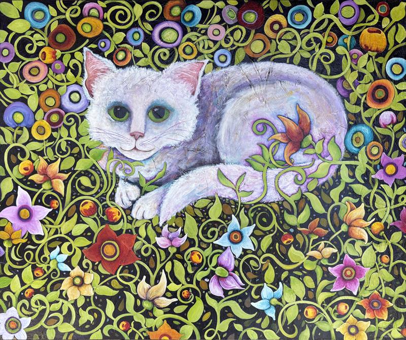 Magical Cat, Mystical Garden 20x24, Oil on Textured Wood Panel,  $750 by: MaryAnita Winklea Honorable Mention Entry ID: 575511