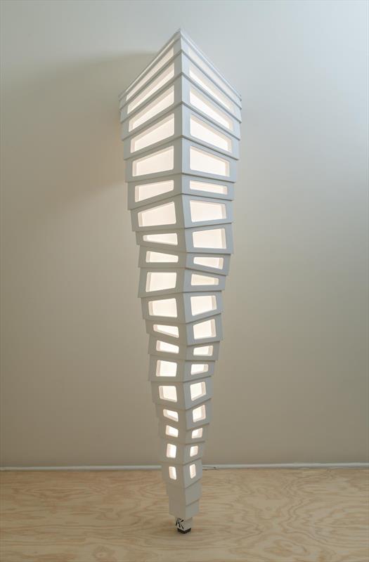 chaos wormhole light sculpture in white 77.5x22x32, baltic birch plywood, acrylic,  $7000 by: ashoke chhabra Entry ID: 577876