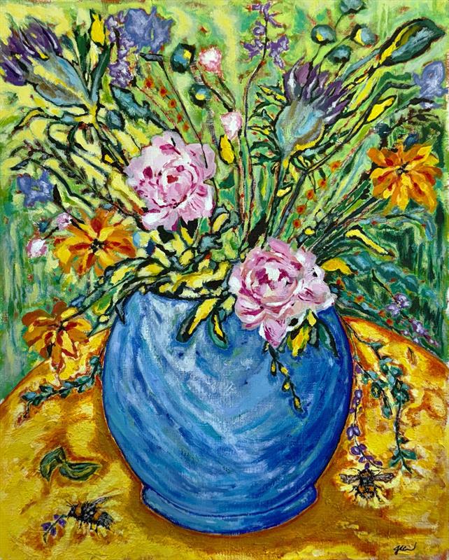 Two Bees and a Blue Vase 23x19, Acrylic and Ink,  $750.00 by: Julianna Aparicio-Curtis Entry ID: 583778