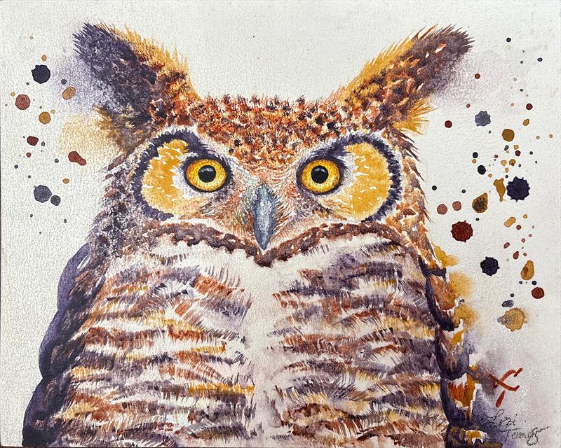 Caffeinated (Great Horned Owl) 8x10, Watercolor,  $125 by: Lori Tews Entry ID: 586004