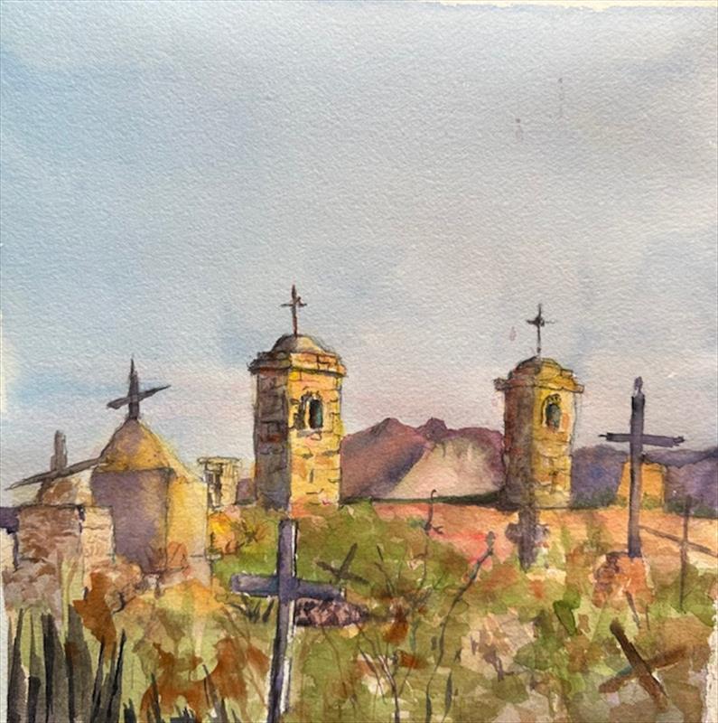 Terlingua Cemetery 10x10, Watercolor,  $250 by: Cindy Schiffgens Entry ID: 594649